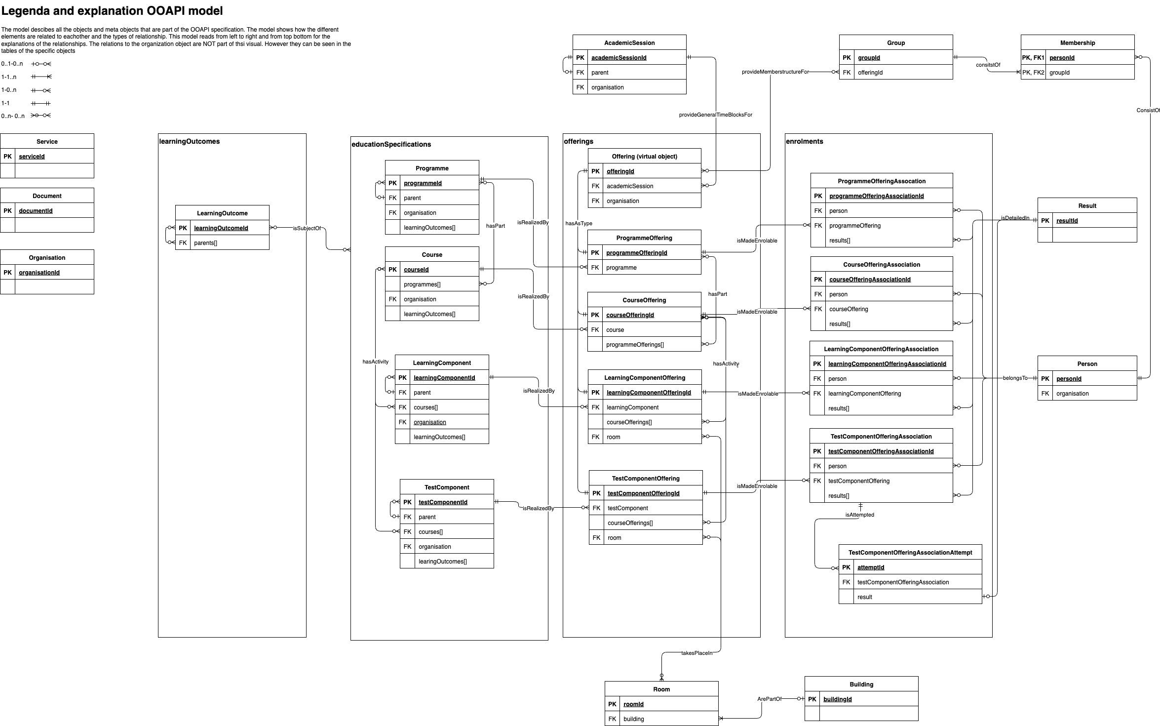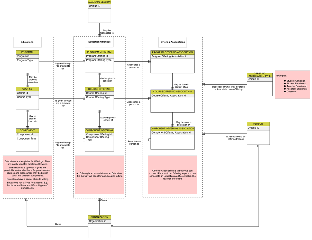 | Person → ProgrammeOfferingAssociation, CourseOfferingAssociation, LearningComponentOfferingAssociation, TestComponentOfferingAssociation | enrolled via | 1 : 1 | Person's enrolment/participation in offerings at various levels (programme, course, component, test) with role and status |